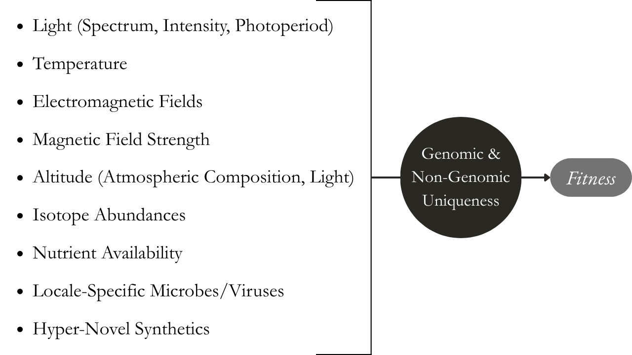 Natural signals that are constrained by the limits Earth’s niche. For example, equatorial regions are generally characterised by relatively stable photoperiods, higher photon energy and flux, low magnetic field strength, high average temperature and greater access to carbohydrates (↑2H, ↑13C). Conversely, polar regions experience significant seasonal fluctuations in photoperiod and spectral content, with relatively high magnetic field strength, low temperatures and greater reliance on provisions from higher trophic levels (↓2H, ↓13C, ↑15N). Each region on Earth has a unique set of dynamic environmental signals that, when faithfully integrated, can produce adaptive changes.5 Importantly, these signals are filtered by both the genomic and non-genomic uniqueness of each individual. This suggests that even in the presence of a true environment, if one’s unique adaptations were forged in a different environmental niche, such signals may still elicit maladaptive responses.6